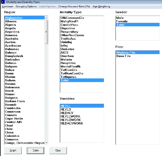 Then, select the Variables to display: either Years of Life Lost (YYL), Years of Living with Disability (YLD), or Disability Adjustment Living Years (DALY). DALY is calculated by adding together YYL and YLD, so that YYL + YLD = DALY. Selecting the variables that end in the suffix WORK will limit the years lost to only working years, instead of total years.